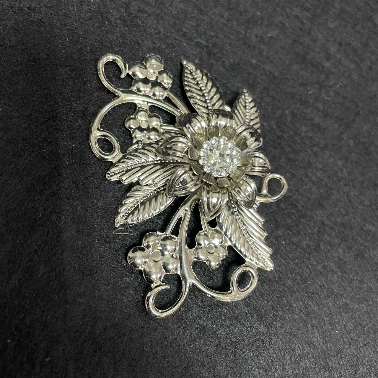Брошь мет.перфор. Цветок, 6*4,5см никель, бел.камень(69318), шт